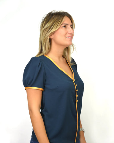 A nice drop in the back, small ball sleeves and a V neckline with small golden buttons ... The pattern has all the elements of a modern top and tendency to wear under a jacket in the office or on a more casual look on weekends Depending on the fabric you choose.